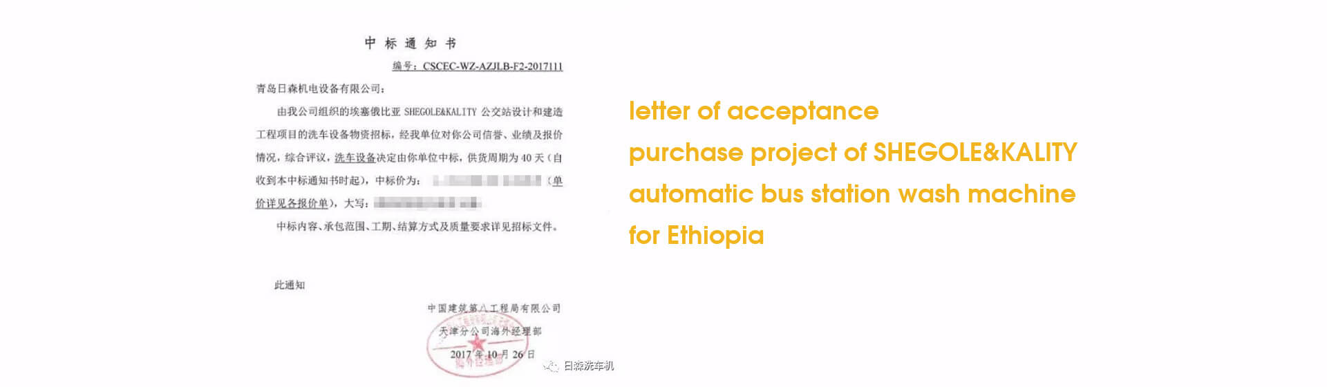 The letter of acceptance of the purchase project of SHEGOLE&KALITY of automatic bus station wash machine for Ethiopia from China Construction Eighth Engineering Division Co., Ltd.