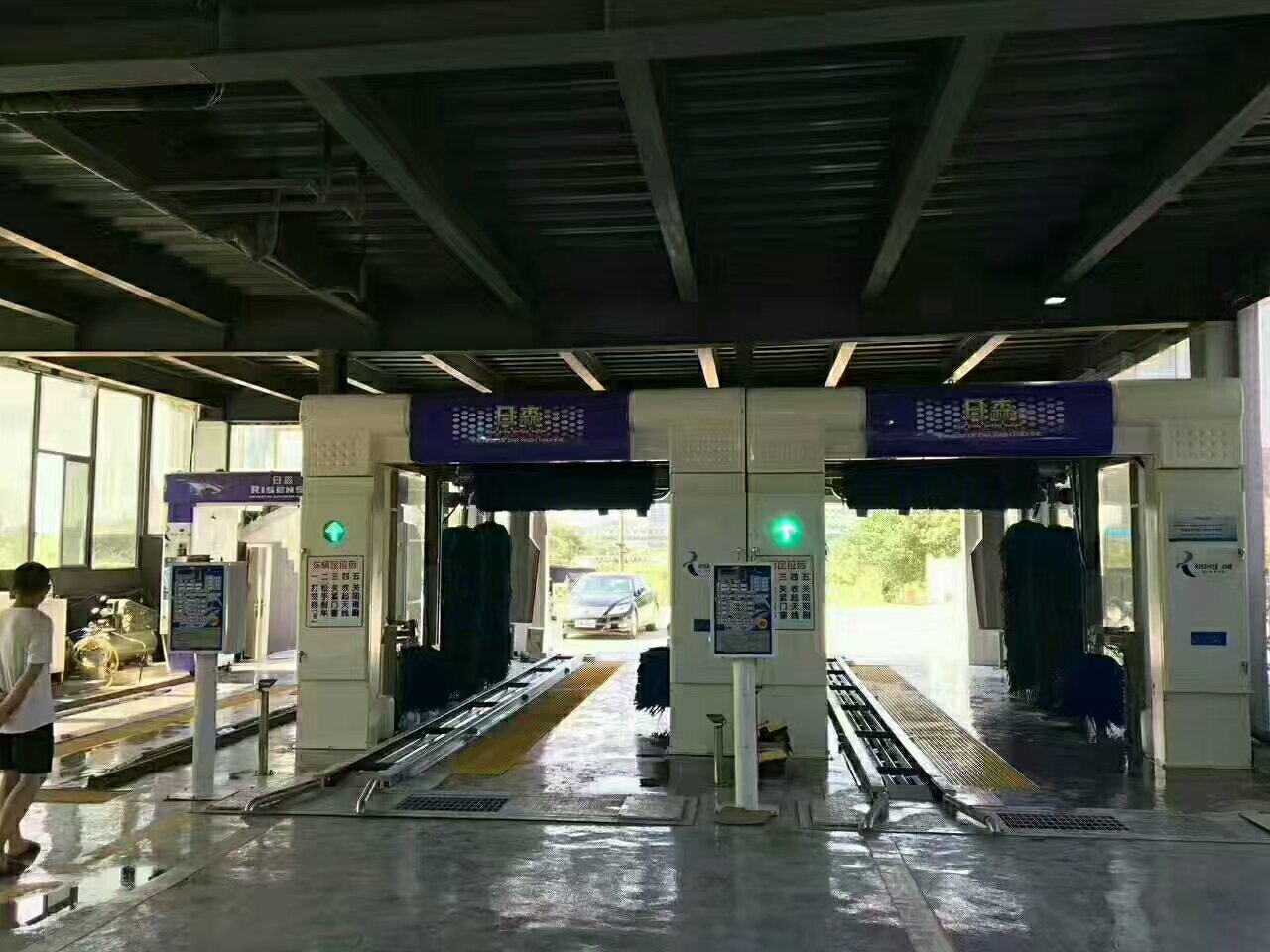 Risense automatic tunnel car wash system is equipped with such advanced technologies as synchronous tire sensor to guide the car into the car wash machine, wheel guild-rail conveyor which can shorten the space, the Japanese second-generation super-soft flannelette brush and foam brush as well as top profiling air-dry.