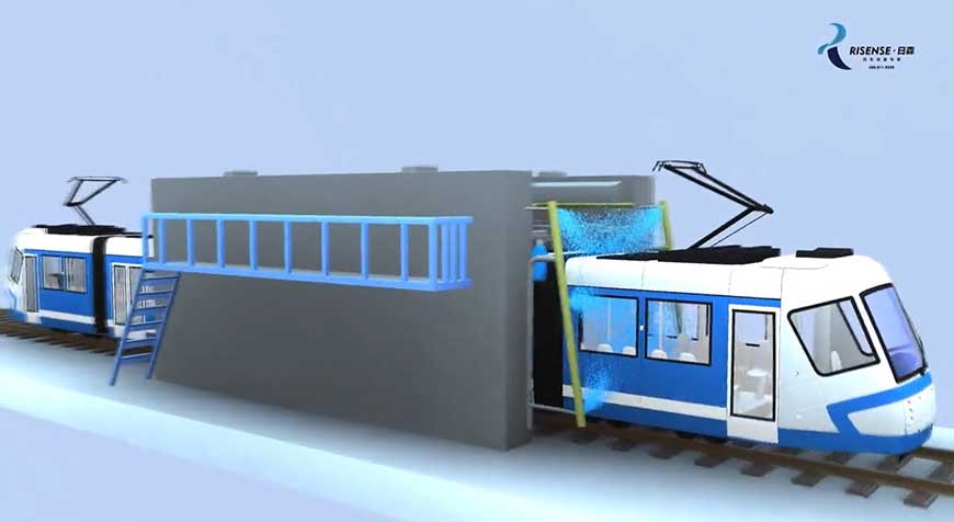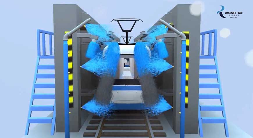 3、增加了清洗車(chē)頭和車(chē)尾的功能。我公司針對(duì)城軌電車(chē)的頭-尾的流線外形,設(shè)計(jì)了仿形清洗技術(shù)。